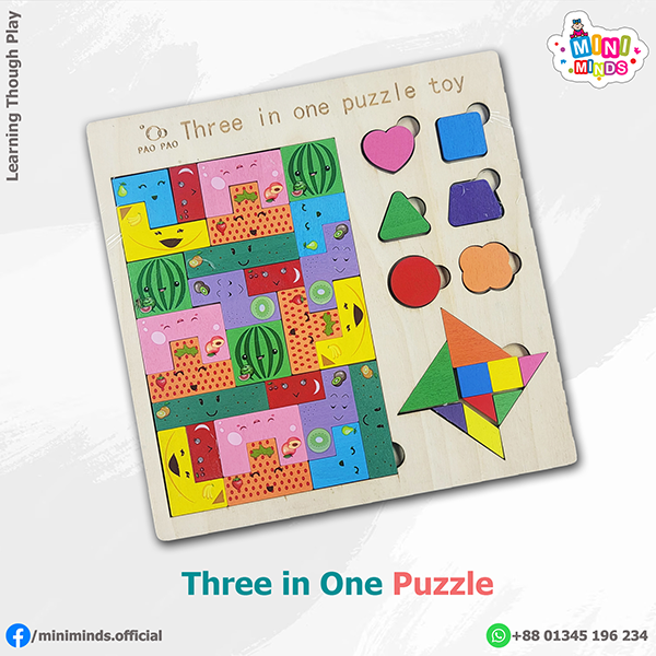 এটি একটি কাঠের তৈরি Three in one puzzle বোর্ড। এতে একই সাথে Tetris style blocks, Geometric shapes, এবং একটি Tangram windmill পাজল সেট রয়েছে। রঙবেরঙের ফল ও শেপ দিয়ে সাজানো এই খেলনাটি বাচ্চাদের একঘেয়েমি দূর করে।